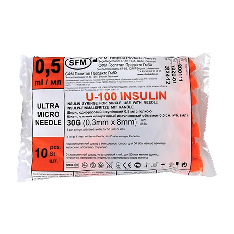 Шприц 3-х дет. (SFМ) 0,5 мл инсулин U-100, интегрир. игла 30G (0,3 х 8,0)/Германия/ |