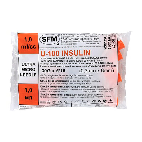 Шприц 3-х дет. (SFМ) 1 мл инсулин U-100, интегрир. игла 30G (0,3 х 8,0)/Германия/ |